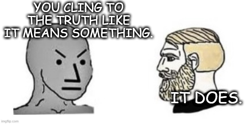 I don’t say that to invoke Christ as a magic spell. The basic beliefs of Christianity are sufficient to resist lies even when the Big Guy doesn’t show up. Only when you understand the spiritual conflict underlying the material conflict, does the relentless ((totalitarian)) assault upon humanity and Truth become clear. Only then do the social experiments at twisting us away from fatherhood and hardwired human nature make sense. There’s no need for Jesus to actually show up, for us to see plainly why the sociopaths… inexplicably calling the shots these days, unless one notices the sudden, simultaneous and global collapse of the organized Church… are offering us endless, endless lies. They hate the truth.